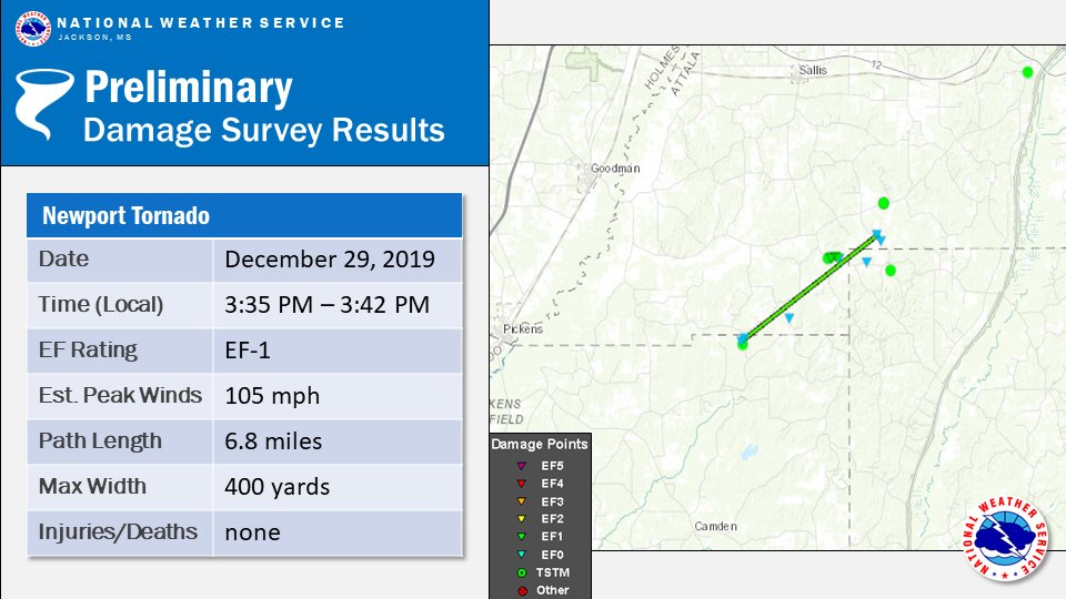 An EF-1 tornado has been confirmed from yesterday's storms. It touched down in far northern Madison Co. and lifted in southern Attala Co. This tornado mainly damaged trees but also a small outbuilding and a pumphouse. Max winds 105 mph, max width 400 yards, 6.8 mile path l...