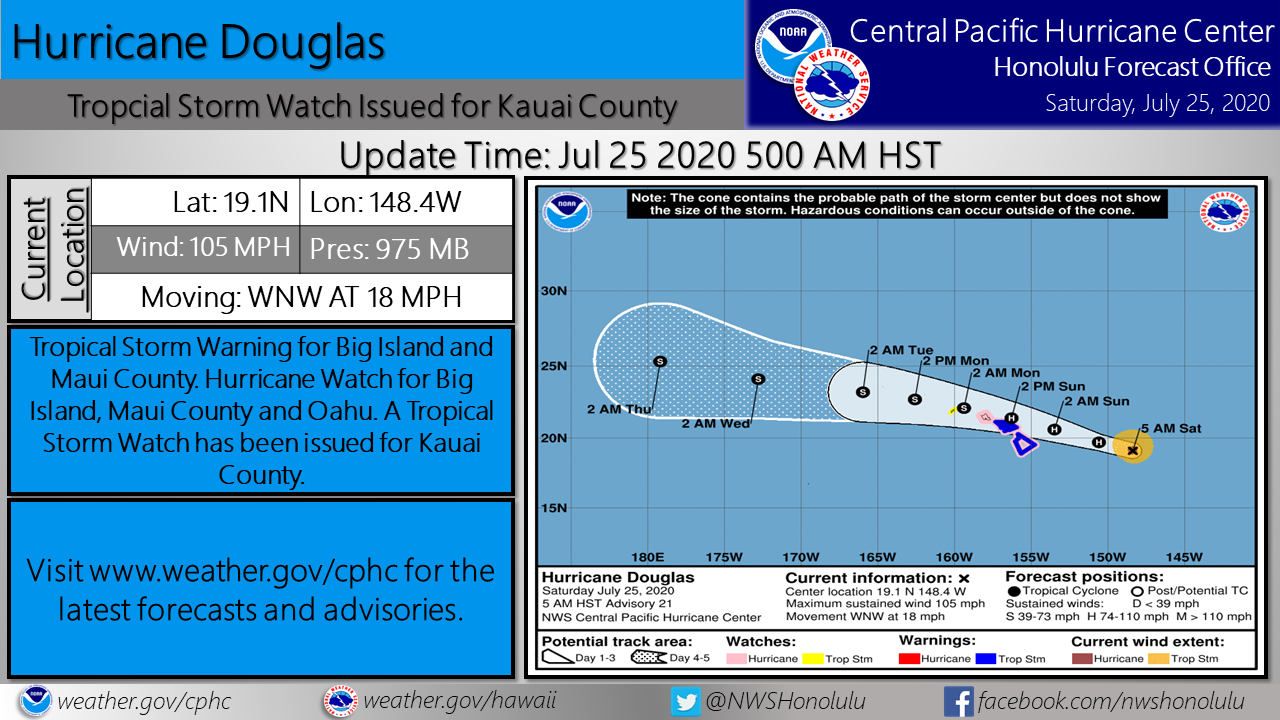 Jul, 25, 2020 5 AM HST UPDATE: Tropical Storm Warning for Big Island and Maui County. Hurricane Watch for Big Island, Maui County and Oahu. A Tropical Storm Watch has been issued for Kauai County. #hiwx